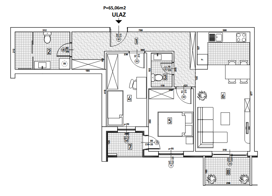 Stan se odlikuje izuzetno funkcionalnim rasporedom i sastoji se iz dve spavaće sobe, wc-a i kupatila, dnevnog boravka sa trpezarijom i kuhinjom, lođe i balkona.